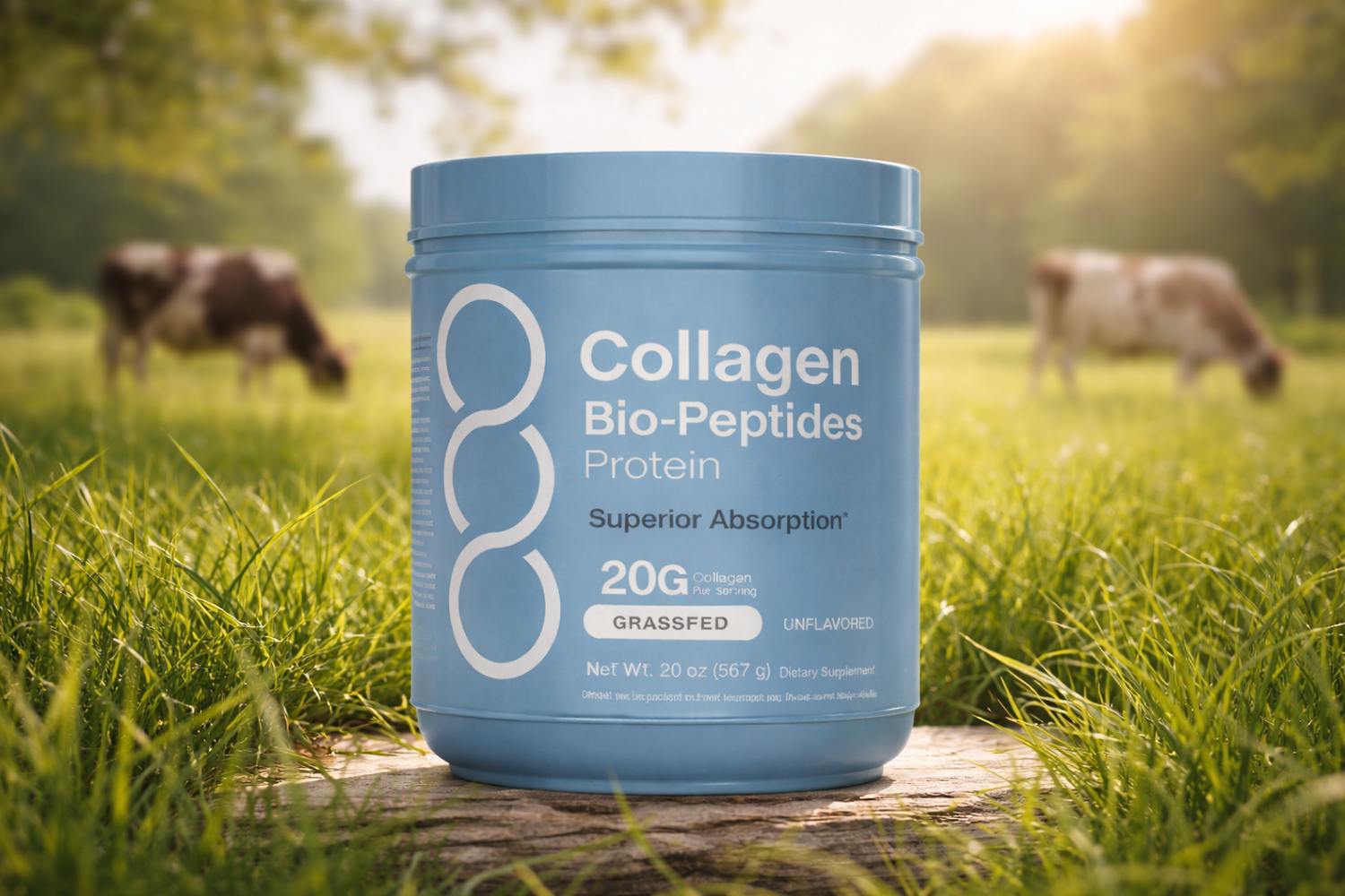 Colágeno de origen bovino, animales criados con alimentación a base de hierba, en lugar de piensos industriales, para una materia prima seleccionada de alta calidad.
